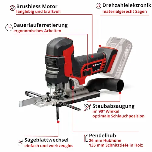 Durch die Kombination dieser fortschrittlichen Technologien und durchdachten Designs wird die Einhell Akku-Stichsäge TP-JST 18/135 zu einem unverzichtbaren Partner bei all deinen Heimwerkerprojekten. Dank des kabellosen Betriebs bietet sie eine unvergleichliche Flexibilität bei allen Projekten.