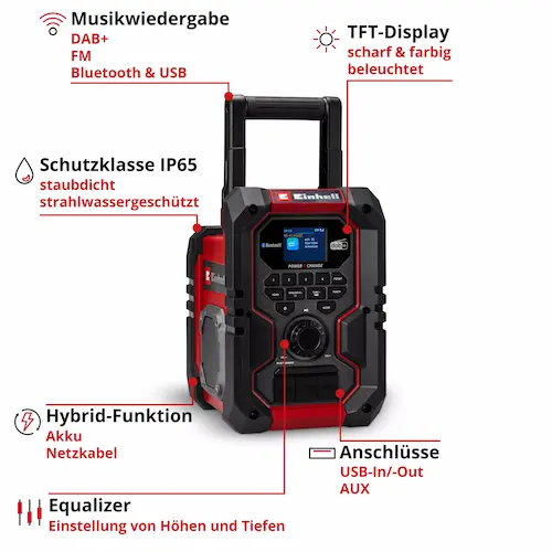 Das Einhell Akku-Radio TE-CR 18 Li DAB+/FM/BT zeichnet sich durch hohe Flexibilität und Robustheit aus. Es ist Teil der Power X-Change Familie, wodurch vorhandene 18 V Akkus universell genutzt werden können. Die Hybrid-Funktion ermöglicht den Betrieb sowohl mit Akku als auch mit Netzteil. Das stoßfeste und nach IP65 zertifizierte Gehäuse schützt das Gerät zuverlässig vor Staub und Strahlwasser. Damit eignet sich das Radio optimal für den Einsatz auf Baustellen oder im Garten, wo wechselnde und herausfordernde Bedingungen herrschen.